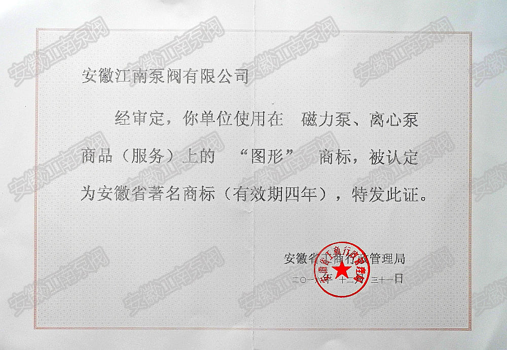 安徽江南泵閥有限公司榮獲磁力泵,離心泵宣城市知名商標(biāo),主營(yíng):氟塑料泵,不銹鋼泵,耐腐蝕化工泵,品質(zhì)卓越,行業(yè)領(lǐng)跑企業(yè),科研生產(chǎn)型企業(yè)20年鑄就行業(yè)輝煌!...
