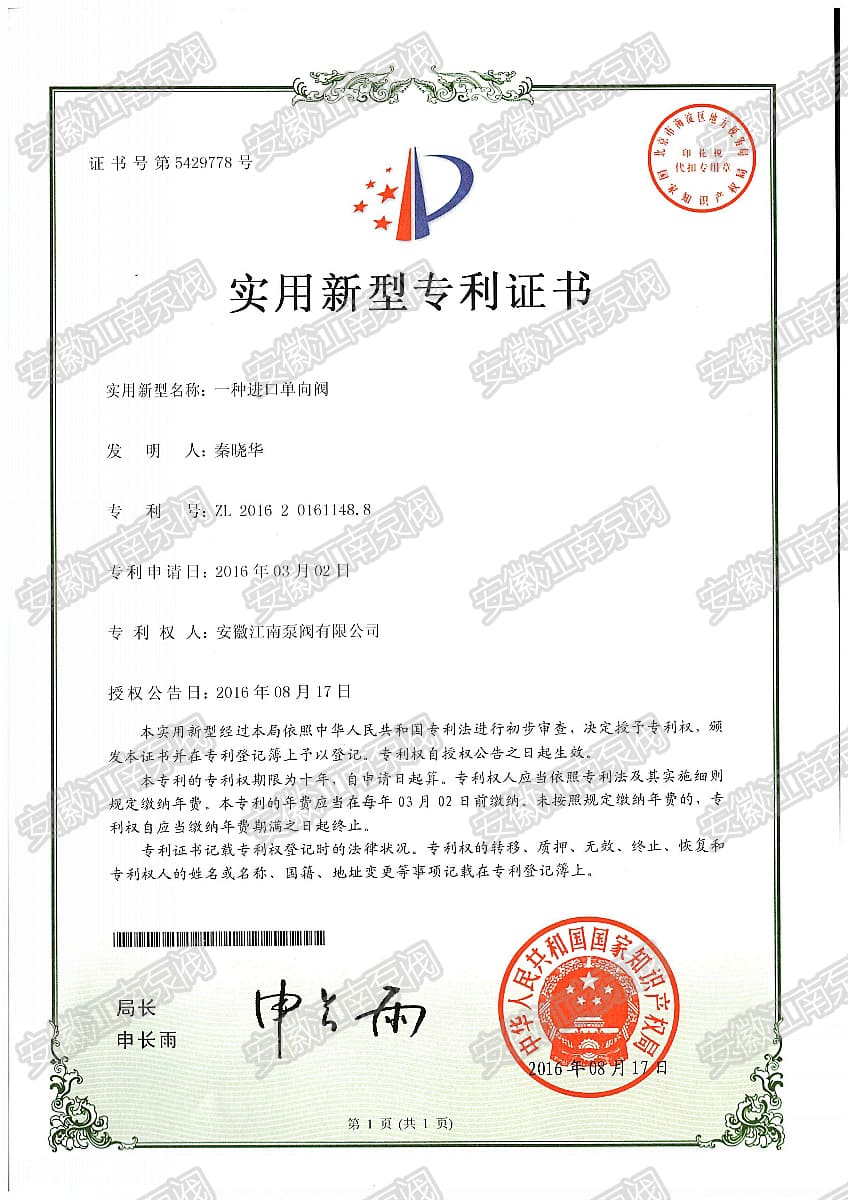 安徽江南泵閥有限公司榮獲進口單向閥門專利證書,主營:氟塑料泵,不銹鋼泵,耐腐蝕化工泵,品質(zhì)卓越,行業(yè)領(lǐng)跑企業(yè),科研生產(chǎn)型企業(yè)20年鑄就行業(yè)輝煌!...