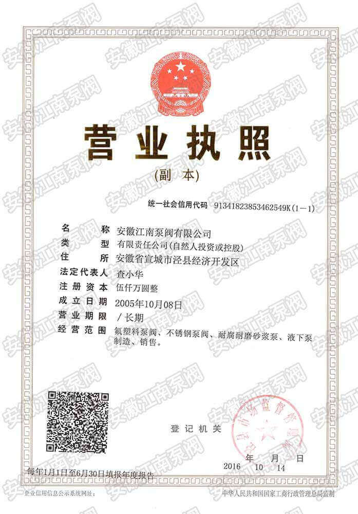 安徽江南泵閥有限公司榮獲泵閥營業(yè)執(zhí)照,主營:氟塑料泵,不銹鋼泵,耐腐蝕化工泵,品質卓越,行業(yè)領跑企業(yè),科研生產型企業(yè)20年鑄就行業(yè)輝煌!...